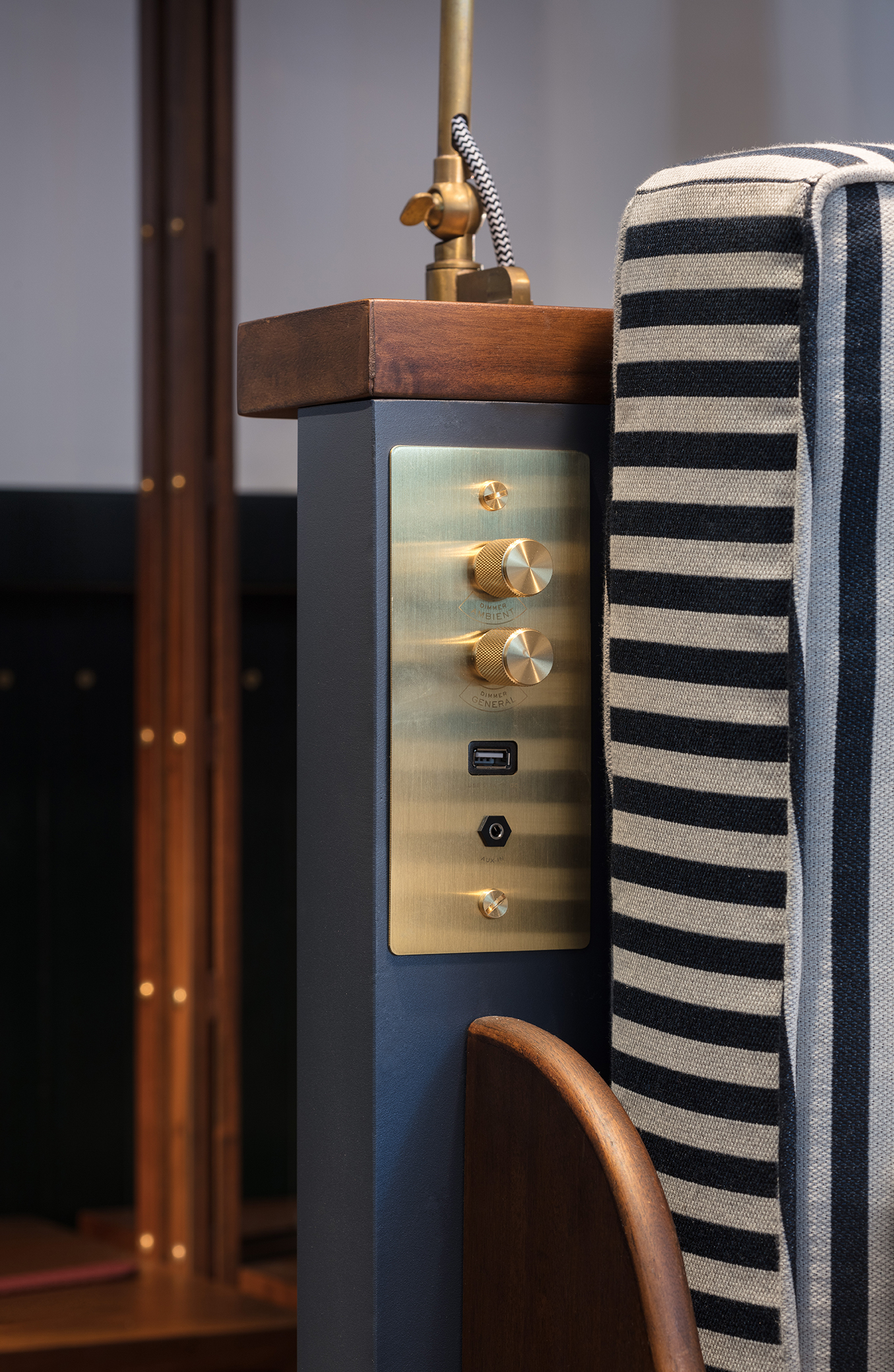 The colour palate of the hotel with bottle green details, and brass finishes mimic the look and feel of the ferries throughout the hotel.